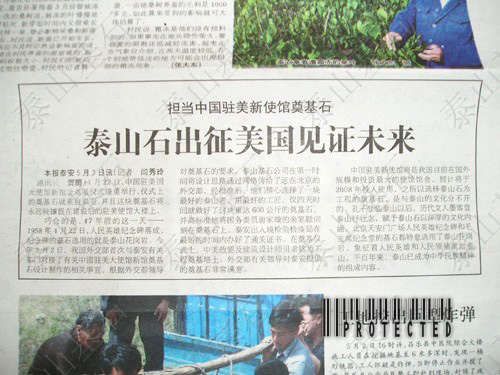 2005年4月22日,中國駐美國大使館新館舍奠基儀式隆重舉行,儀式上的奠基石就來自泰安,并且這塊奠基石將永遠被鑲嵌在建成后的駐美使館大樓上。巧合的是,47年前的這一天--1958年4月22日,人民英雄紀(jì)念碑落成,紀(jì)念碑的基石選用的就是泰山花崗巖。今年3月2日,我國外交部首次與泰安有關(guān)部門對接了有關(guān)中國駐美大使館新館舍奠基石設(shè)計制作的相關(guān)事宜,根據(jù)外交部領(lǐng)導(dǎo)對奠基石的要求,泰山基石公司在第一時間將設(shè)計思路通過網(wǎng)絡(luò)傳給了遠在北京的外交部,經(jīng)批準(zhǔn)后,公司精心選擇了一塊泰山青,用最好的工匠,用一個星期就做好了這塊重達600公斤的奠基石,并高標(biāo)準(zhǔn)地將國務(wù)委員唐家璇的親筆題詞刻在奠基石上。在奠基儀式上,中美政要及華裔著名建筑設(shè)計師貝聿明為工程奠基培土,外交部領(lǐng)導(dǎo)對公司提供的奠基石非常滿意。 中國駐美大使館將是我國目前在國外規(guī)模最大館舍,預(yù)計將于2008年投入使用。之所以選用泰山石為工程的奠基石,是與泰山的文化分不開的?鬃拥桥R泰山以后,歷代文人墨客登泰山抒壯志,賦予泰山石以深厚的文化內(nèi)涵。北京天安門廣場、人民英雄紀(jì)念碑、人民大會堂的基石都特意選用了泰山花崗巖,象征著穩(wěn)如泰山。千百年來,泰山已成為中華民族精神的組成內(nèi)容。